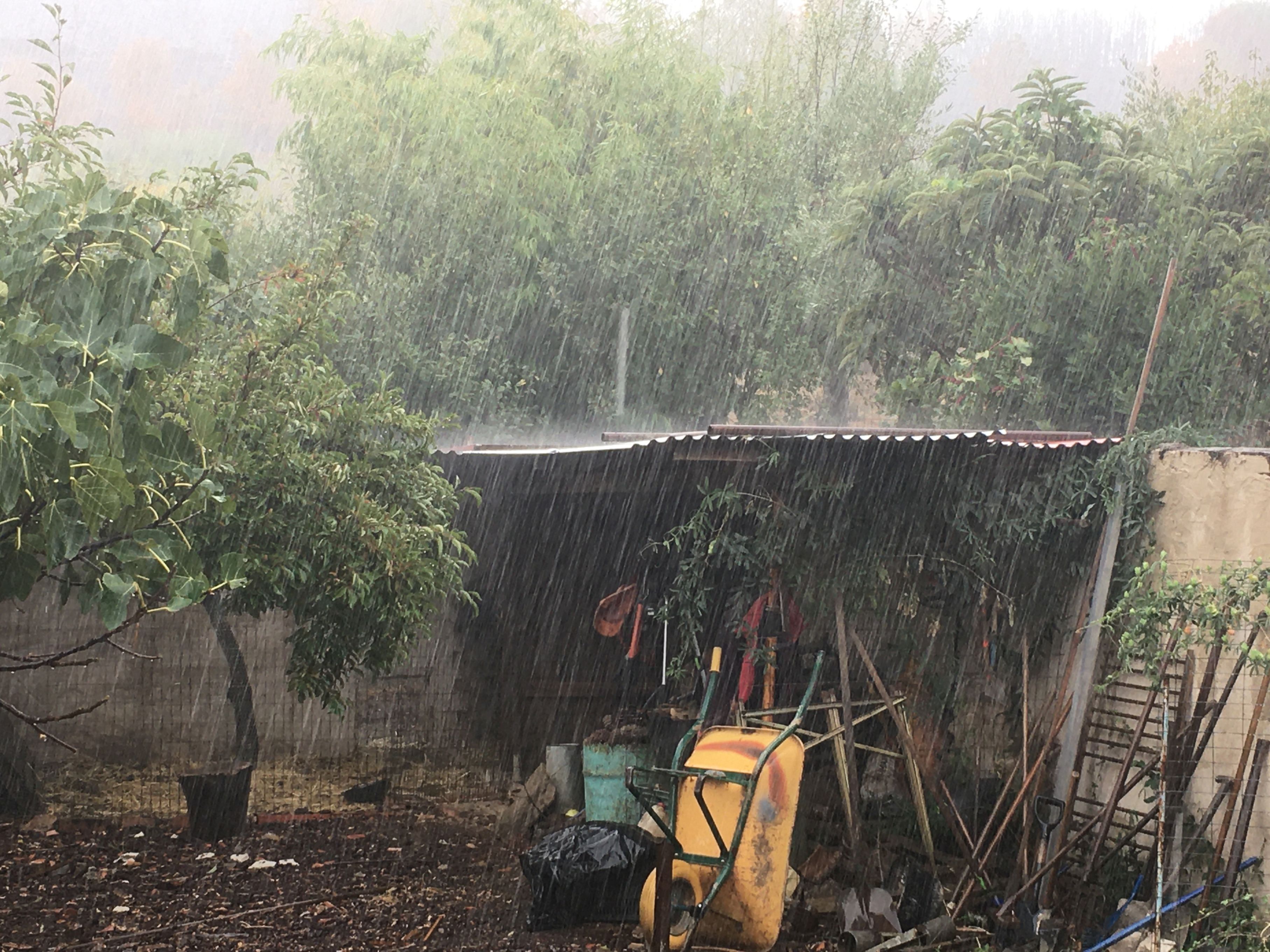 Nach fast drei einhalb Monaten ohne einen Tropfen hat es gestern endlich angefangen, richtig zu regnen. In den letzten 24 Stunden haben sich 2 qm Regenwasser in unseren Regenspeichern gesammelt, obwohl erst das halbe Dach angeschlossen ist.