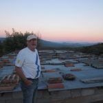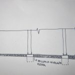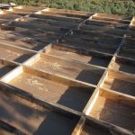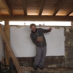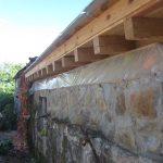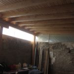 Las viguetas finalemente las hemos dejado vistas, en vez de usarlas como los cajones para el aislamiento, y claveteado la tarima machiembrada de pino desde arriba(2). Fue una decisión tomada en obra, convencidos por nuestro gran amigo carpintero Fede… son tan bonitas que nos hubieramos arrepentido de taparlas. Hemos ganado además un poco de altura pero por contra, llevó unos días más fabricar los cajones para el relleno. Como barrera de vapor hemos usado papel Kraft, una recomendación de Mónica que funciona a la perfección y bastante económica (3). Para el aislante habíamos pensado en la paja, pero nos han regalado unos paquetes de celulosa tratada con Borax(ISOFLOC) que han sobrado de otro proyecto en la Sierra. Mil gracias a Simón y Guy. Este material trabaja de manera muy similar a la paja, por los que hemos mantenido los 15cm de espesor(4). Y para el bajo teja tenemos una lámina impermeable-transpirable (6).