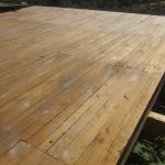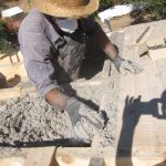 Wir haben Kiefernpaneele auf das Gebälk aus Kastanienholz genagelt (2). Darüber kam eine Lage Krepppapier (atmungsaktiv aber staubundurchlässig) damit die Isolierung nicht durch die Ritzen rieselt(3). Als Dämmstoff haben wir ein Zellulosematerial aus Recyclingpapier (ISOFLOC) verwendet (4). Das sollte eigentlich in einem anderen Projekt eingesetzt werden, kam jedoch nie zum Einsatz und so durften wir es uns nun abholen. Sozusagen doppelt recycelt. Ein dickes Dankeschön an Guy und Simon. Um es vor Ungeziefer, Pilzen und Feuer zu schützen, wurde es vom Hersteller mit Borax vorbehandelt. Wir haben dennoch ein wenig Kalk untergemischt. Da es recht lange im Freien gelagert wurde, wollten wir auf Nummer sicher gehen. Der Einbau war eine etwas staubige Angelegenheit und so ging mal wieder alles mit Maske von statten. Die Isolierkammern wurden mit Kastanienholzbrettern vernagelt (5), mit einem Wasser abweisenden, atmungsaktiven Gewebe bedeckt (6) und vorübergehend mit einer PE-Folie vor dem Regen geschützt. Sobald es das Wetter zulässt, kommt die Folie runter und dafür Dachlatten und Ziegel rauf.