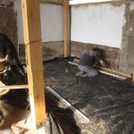 Der erste Teil des Hauses hat jetzt einen waagerechten Fußboden. Ich hätte nicht gedacht, wie viel Arbeit in so einem Fußboden steckt. Um das Gefälle vom Anfang zum Ende des Hauses auszugleichen (fast 20 cm) haben wir Kies aufgefüllt. Eine PE-Folie darauf dient als Feuchtesperre. Das Gemisch aus hydraulischem Kalk, Sand (10 cm) als feste Tragschicht.