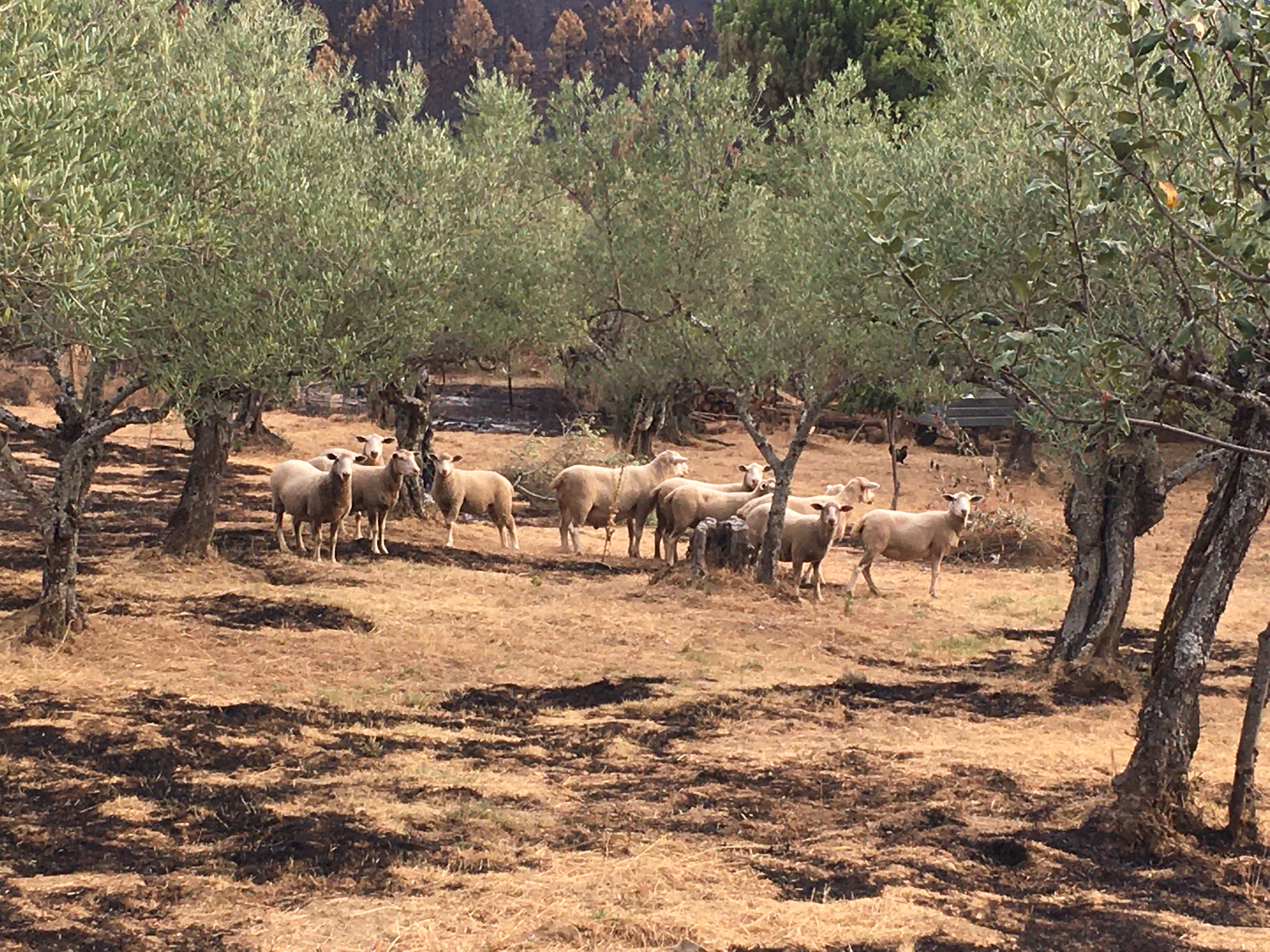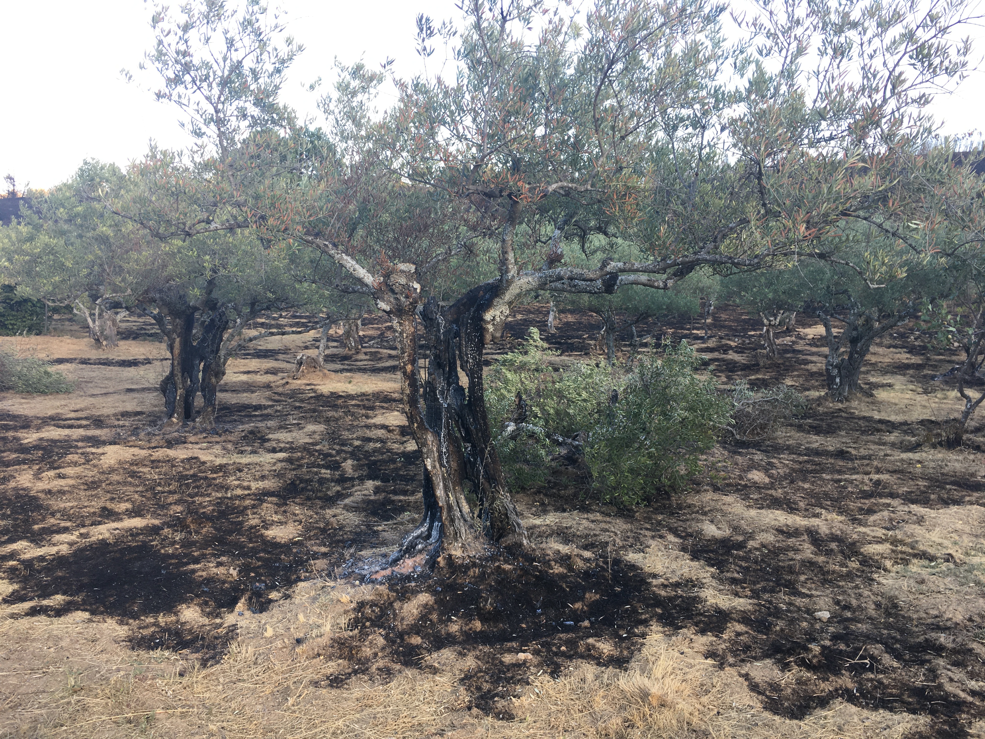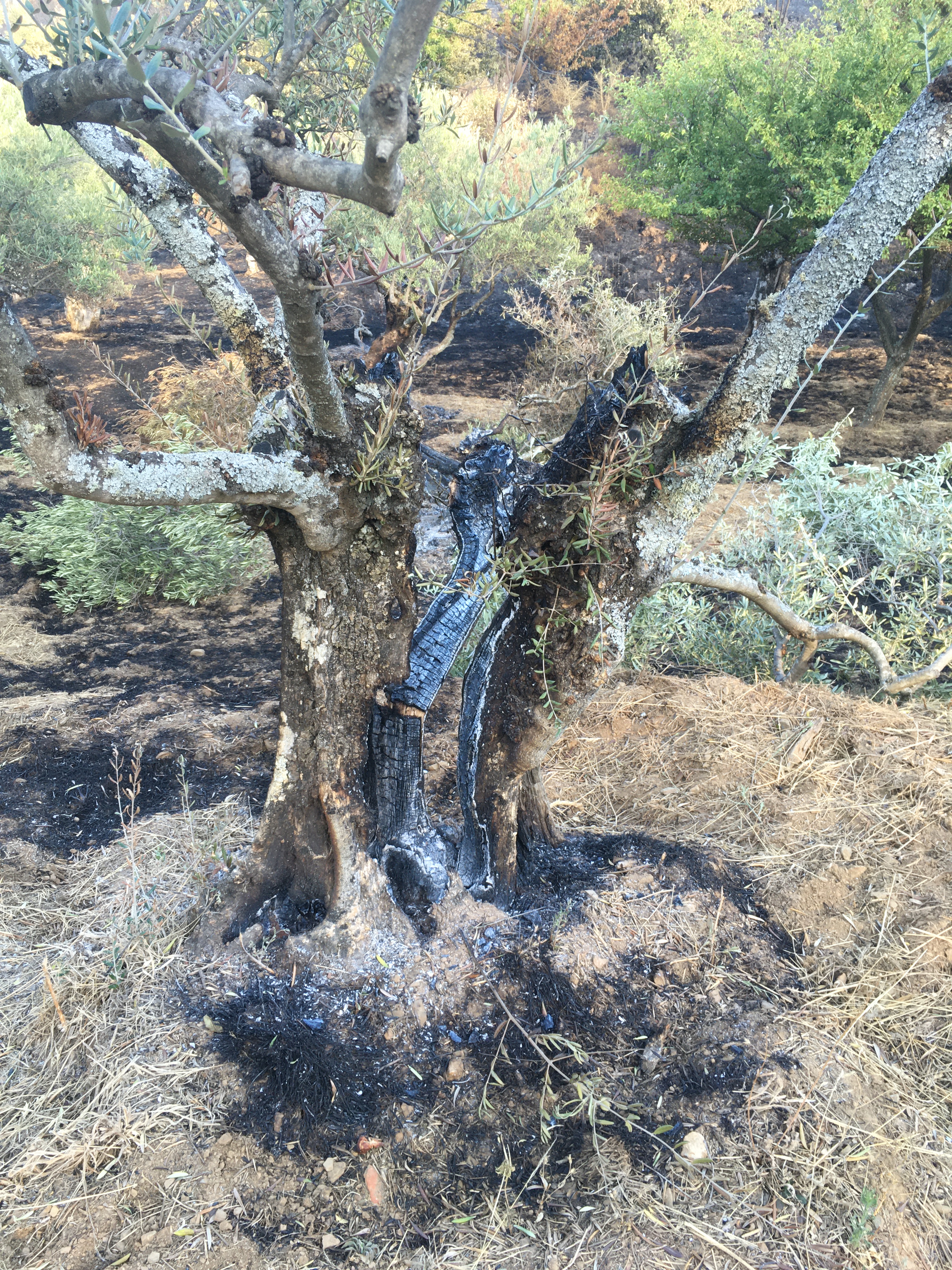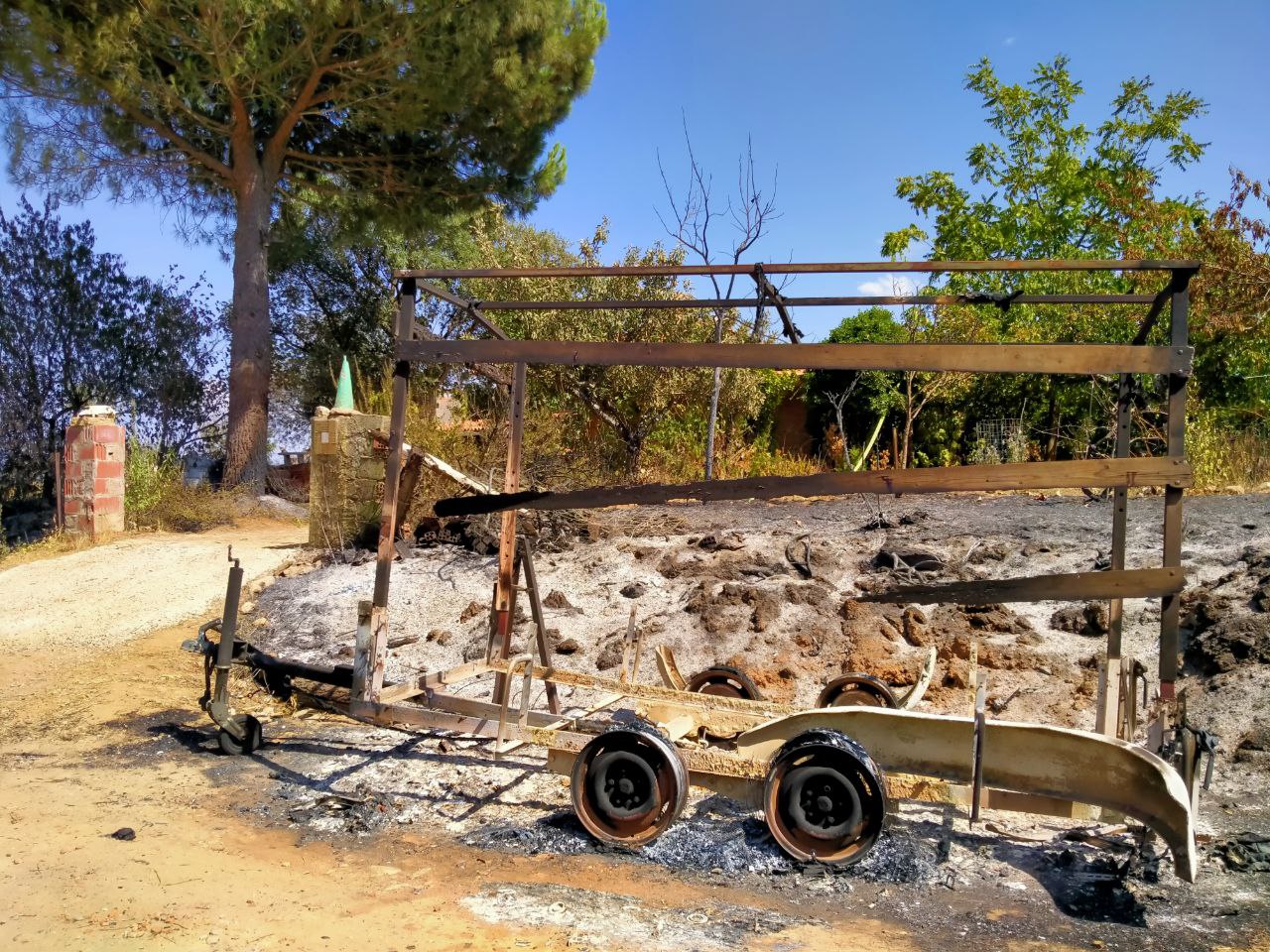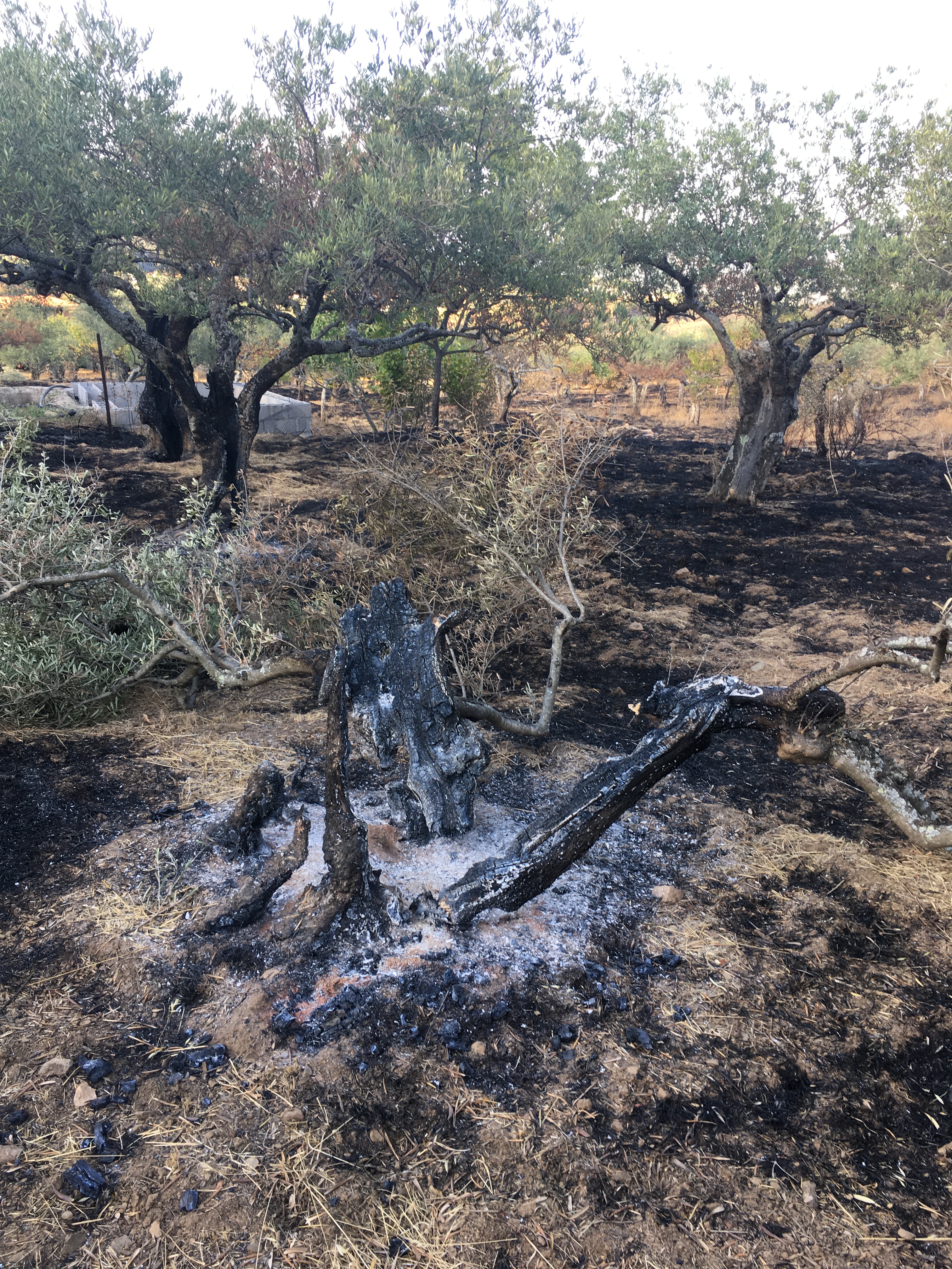 Und so sieht es nun bei uns aus. Wohl am traurigsten ist, dass ein Teil unserer Oliven- und Obstbäume verbrannt ist. Olivenbäume sind stark, doch es wird sicher einigen Jahre dauern, bis sie sich der größte Teil wieder erholt. Bei den anderen Bäumen müssen wir sehen, ob sie neu austreiben. Einige werden es sicher nicht schaffen. Daneben hat es unseren Anhänger, das Gewächshaus, das Baumhaus der Kinder sowie diverse Spiel- und Werkzeuge erwischt.