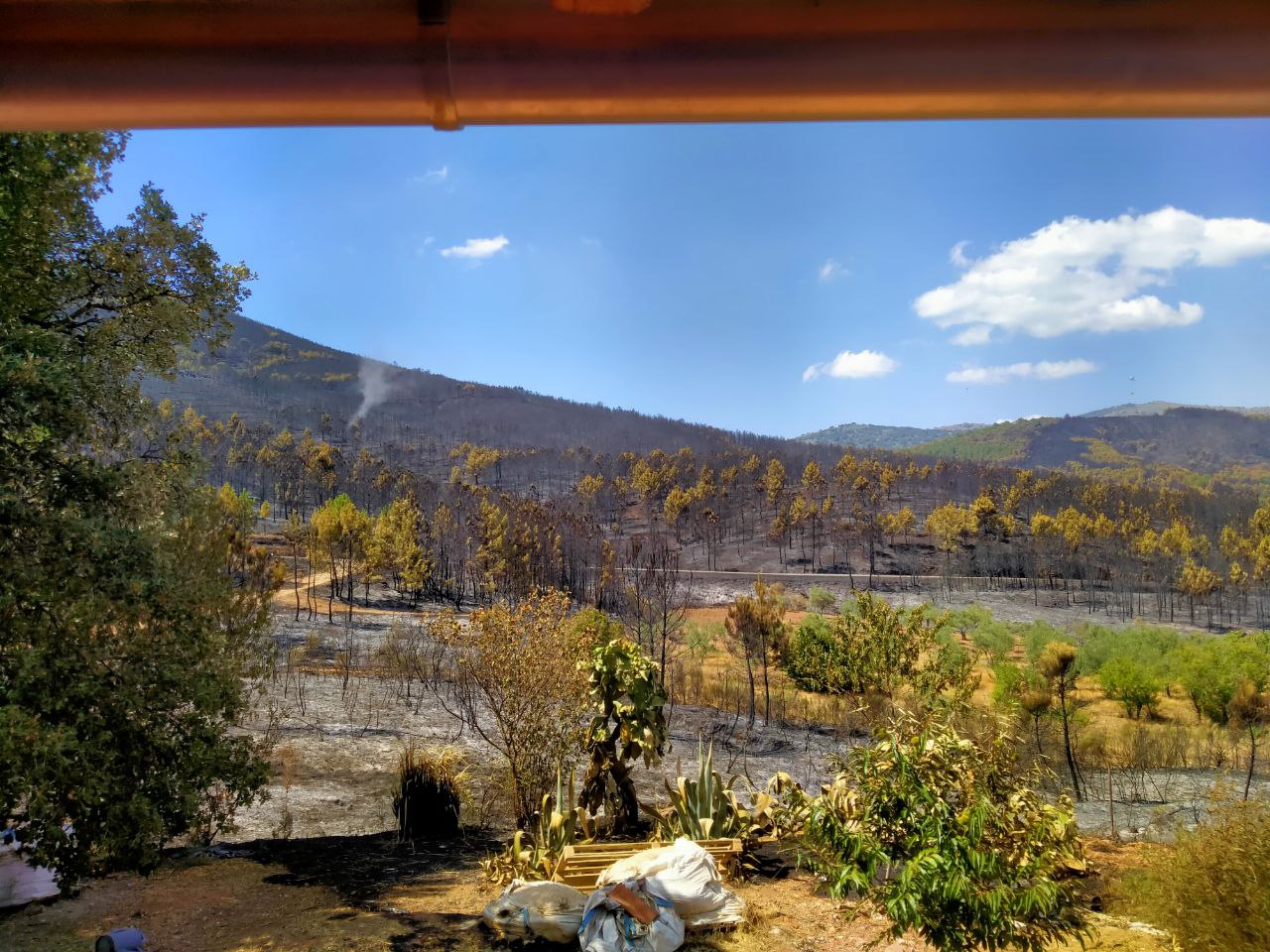 Bevor ihr Euch mit den Fotos ein Bild machen könnt, versuche ich euch zu beschreiben, wie diese Stunden und Tage seither für uns aussahen. Es fing am 10. August am frühen Nachmittag an einer Bundesstraße einige Kilometer entfernt an. Wie schon einige Male zuvor, denn in den vergangenen Jahren haben wir schon einige Feuer dieser Art miterlebt. Immer Brandstiftung. Immer an derselben Straße. Dass es Brandstiftung war, ist daran zu erkennen, dass es an mehreren Stellen gleichzeitig anfing. Dieses Mal allerdings hat es der Wind in unsere Richtung getrieben. Nachdem wir erst einmal beobachtet, wie es sich entwickelt. Wir sind zum Glück sehr gut vernetzt mit unseren Nachbarn. Als abzusehen war, dass es immer näher kommt, haben wir alle wichtige Unterlagen, Kleidung und anderes zusammengepackt, die Autos in Startposition geparkt, Hunde und Katzen zusammen gesammelt, die Hühner freigelassen und so weit es geht um das Haus alles auf- und wegzuräumen. Speziell alles aus Kunststoff.