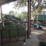 Esta máquina hace vibrar la rama y parece ser que daña menos el árbol que cuando se varea o se „ordeña“. Se trabaja en equipos de dos. Una persona maneja la máquina y la otra va ayudando a seleccionar las ramas y vareando con un palo. El vareo tiene su técnica, pués hay que acercarse mucho a la aceituna, buscar la dirección de caida del fruto y arrastrar más que golpear, pues hay que intentar romper lo menos posible las ramas y hojas pues esto daña al árbol y da peor producción al año siguiente. Colocar las redes, arrastrarlas y recogerlas para meter el fruto caido en las cajas es casi como un baile. Nuestro movientos empizan a ser metódicos y efectivos. El trabajo es cansado pero es un plazer estar al aire libre y ver el beneficio del esfuerzo casi directamente. Hemos conseguido pasar de llenar 5 cajas al día a llenar 15 ( cada una de 20kg).