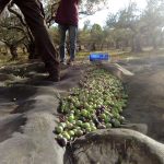 In einem eher schlechten Olivenjahr wie diesem ist die eigentliche Schwierigkeit, die erforderliche Menge für die Mühle (mindestens 1000kg) zusammenzubekommen und dennoch die Oliven nicht länger als nötig in den Kisten liegen zu lassen. Gelöst haben wir es dadurch, dass wir uns mit unseren Freunden zusammengetan haben, die ebenfalls ökologisch anbauen. 2 Tage sammeln, dann alle Kisten gemeinsam in die Mühle fahren und später das Öl untereinander aufteilen.