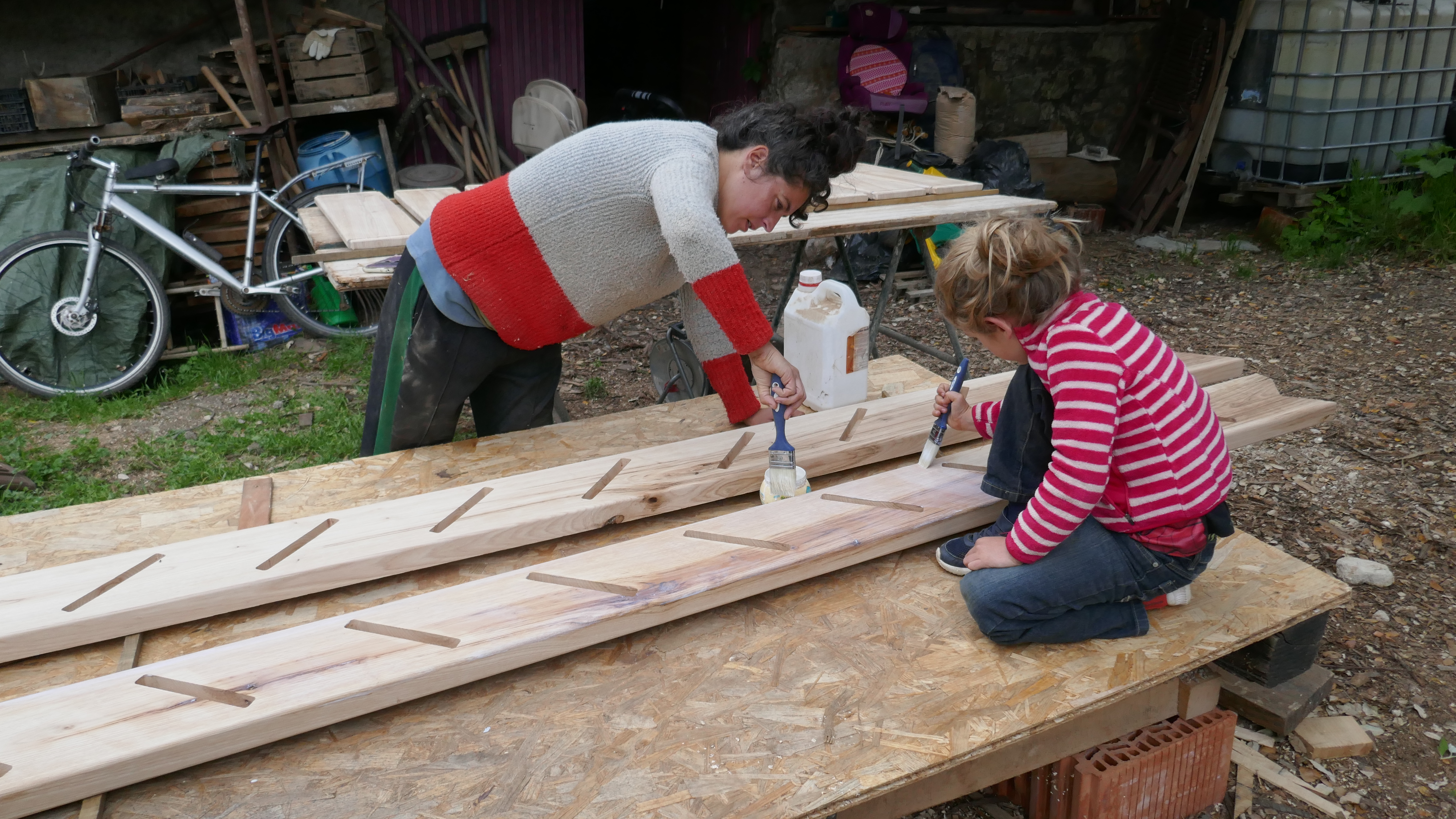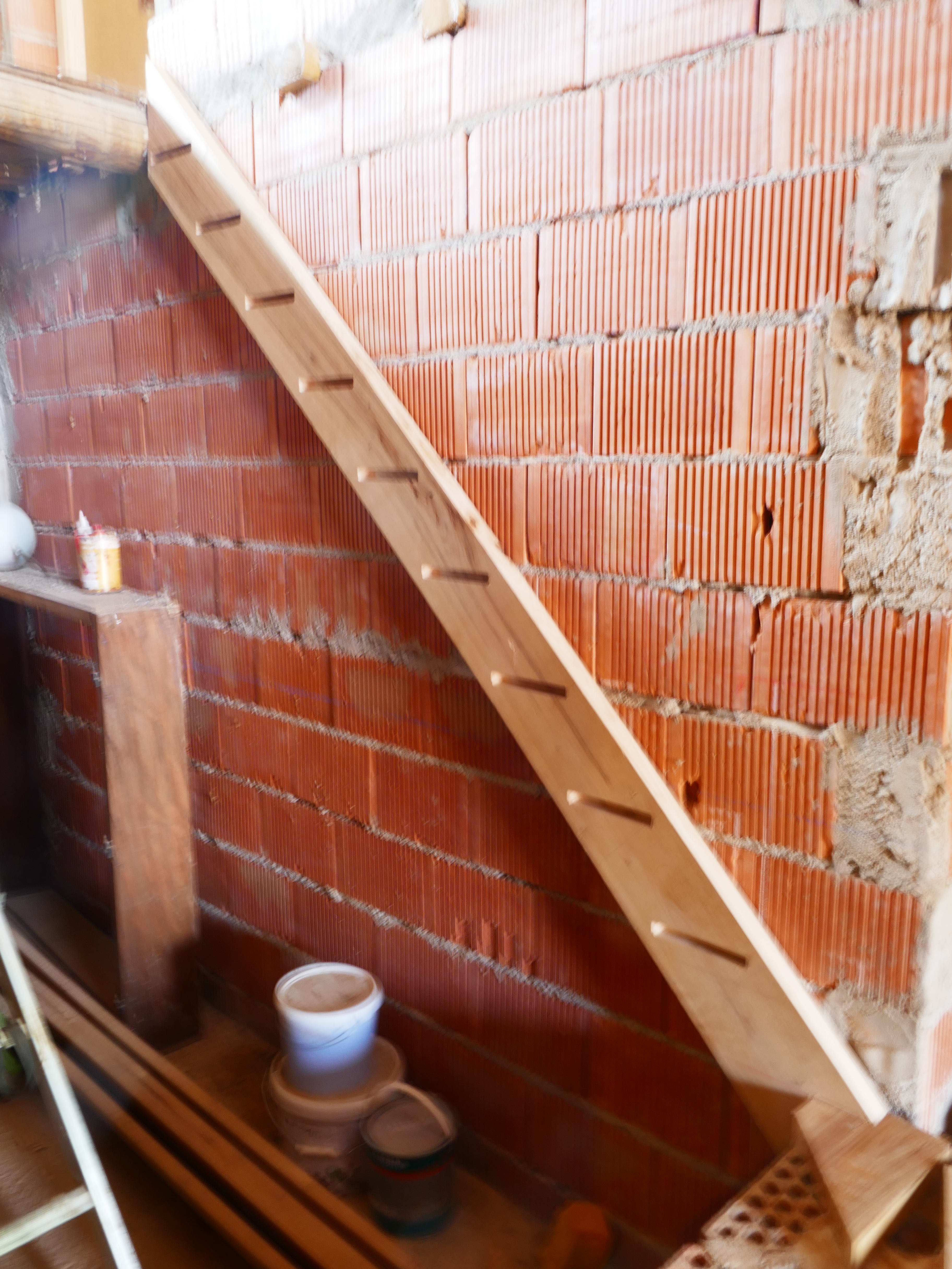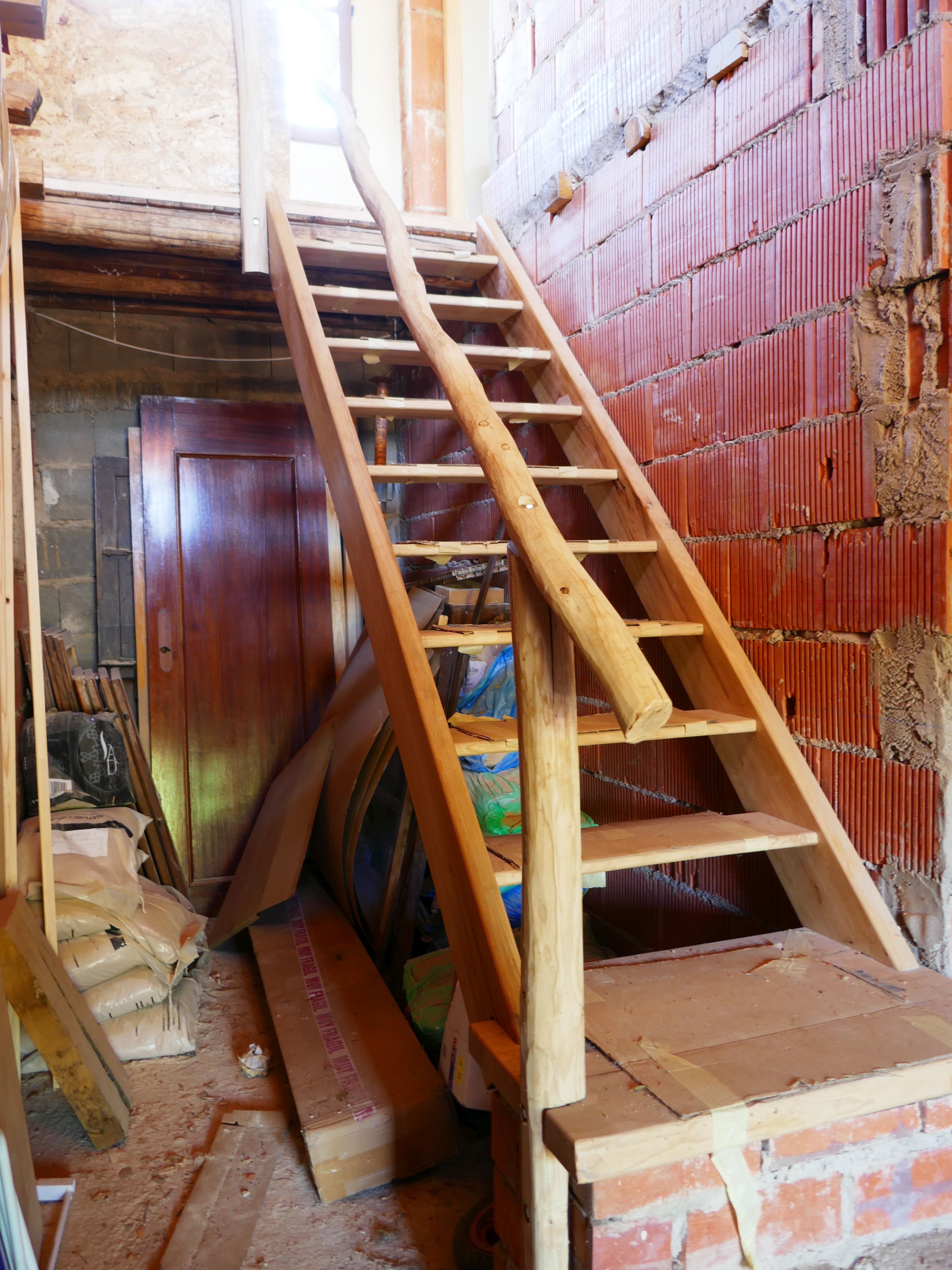 Die Treppe haben wir aus Kastanienholz gezimmert, welches wir im vergangenen Jahr bestellt und hier im Haus getrocknet hatten. Wir konnten unseren Tischlerfreund Miguel dazu überreden, uns bei dem Hauptteil zu helfen. So habe ich einen erstklassigen Kurs Berechnen von Stufen und im Fräsen bekommen. In die erste Stufe habe ich zum Verbinden zweier Bretter ein wenig des Grenadill-Holzes verwendet, welches ich gelegentlich für die Messer verwende. Das Geländer ist aus einer kleinen Eiche gemacht. Es ist noch nicht ganz fertig. Einige Streben aus Lorbeerholz sind noch nicht eingebaut.