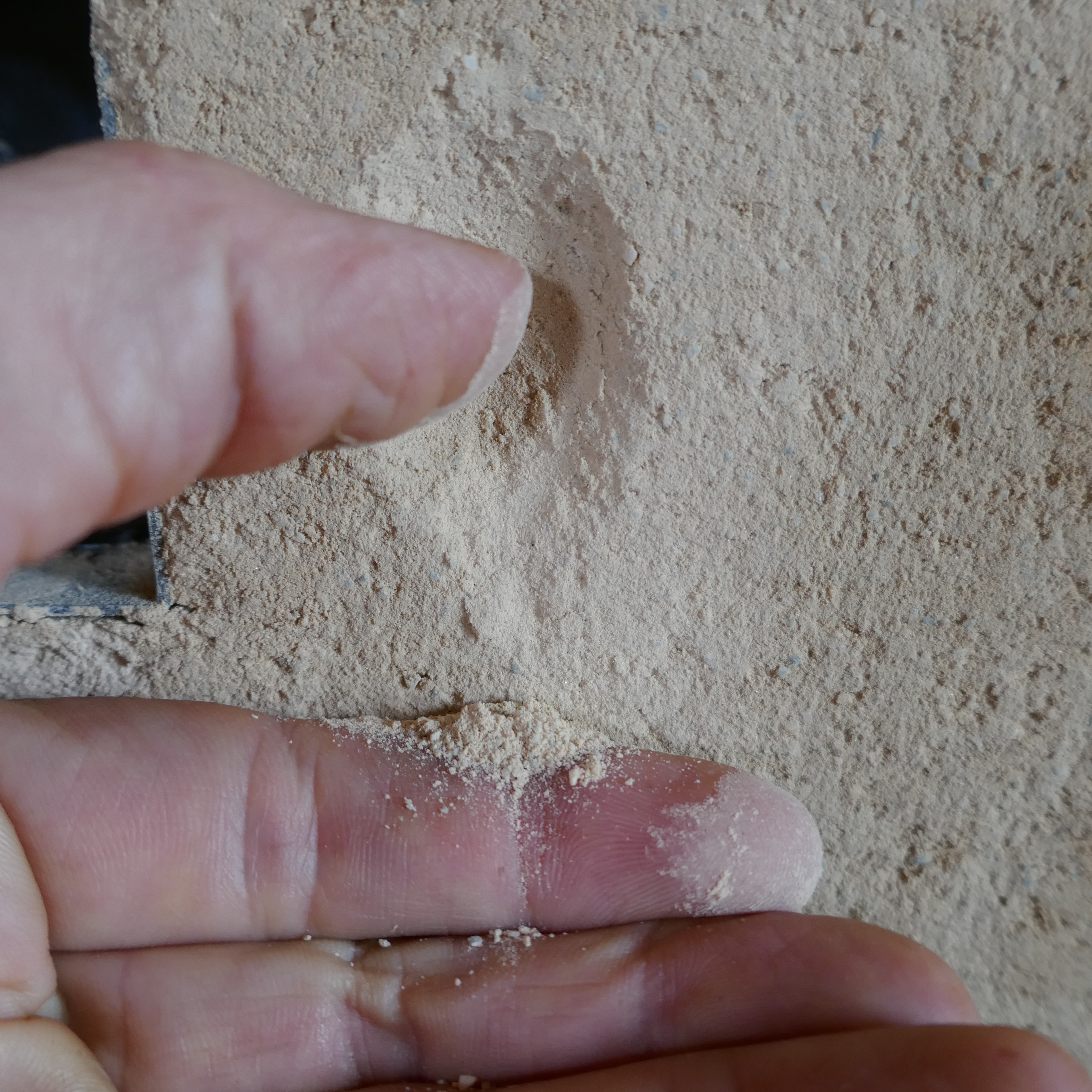 Jetzt haben wir einen normalen Kalkputz auf den Wänden und hoffen, dass wir das Geld für den angeblichen Lehmputz (der laut Labor fast keinen Lehm enthält) zurückbekommen.