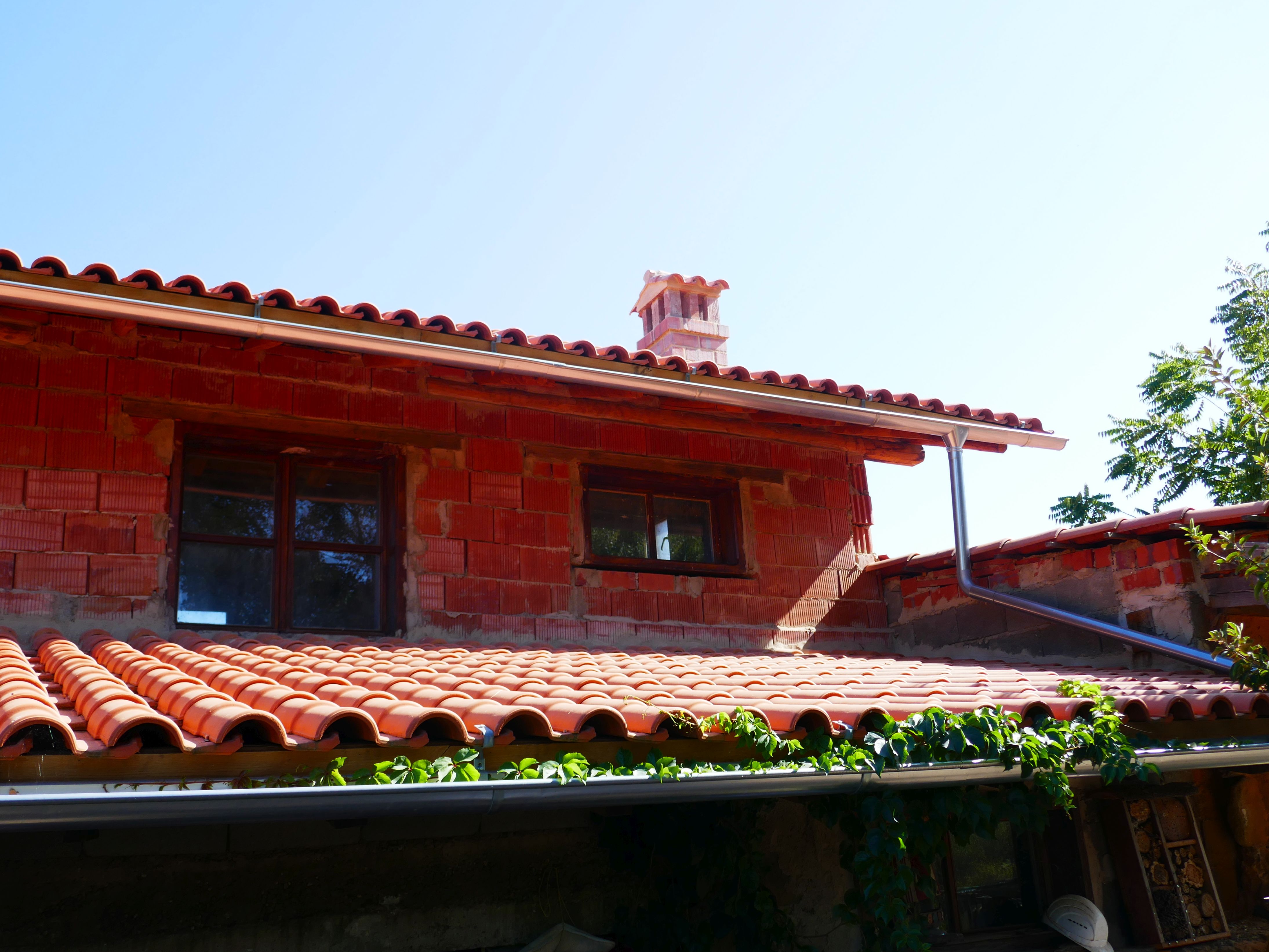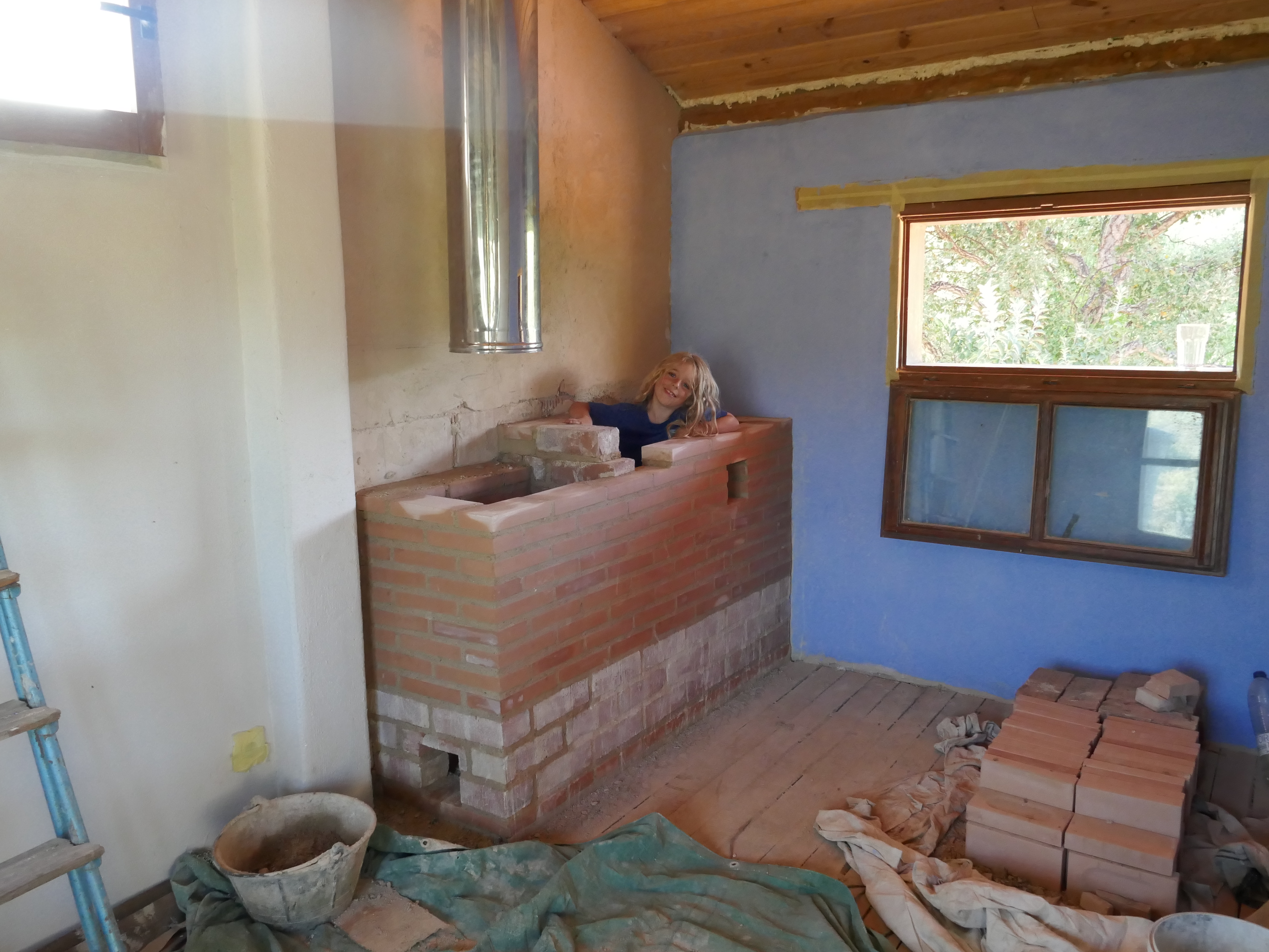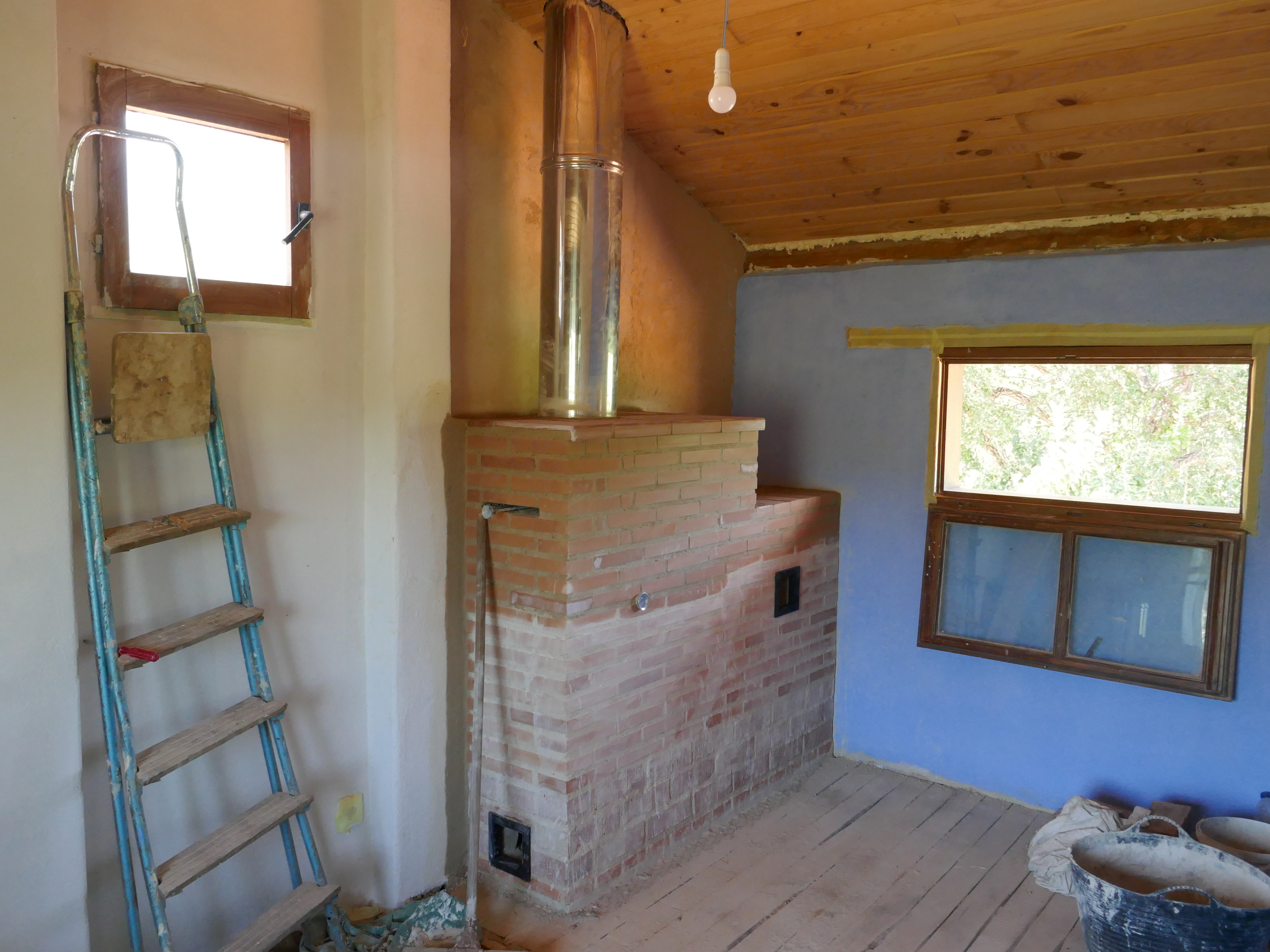 Die Wärmekammer im zweiten Zimmer ist eine Erweiterung unseres Lehmofens. Für den Schornstein mussten wir das neue Dach durchbrechen. Zum Glück haben wir dafür einen Helfer in unserem Umfeld gefunden, der sich damit auskennt, denn damit habe ich mich wirklich schwergetan.