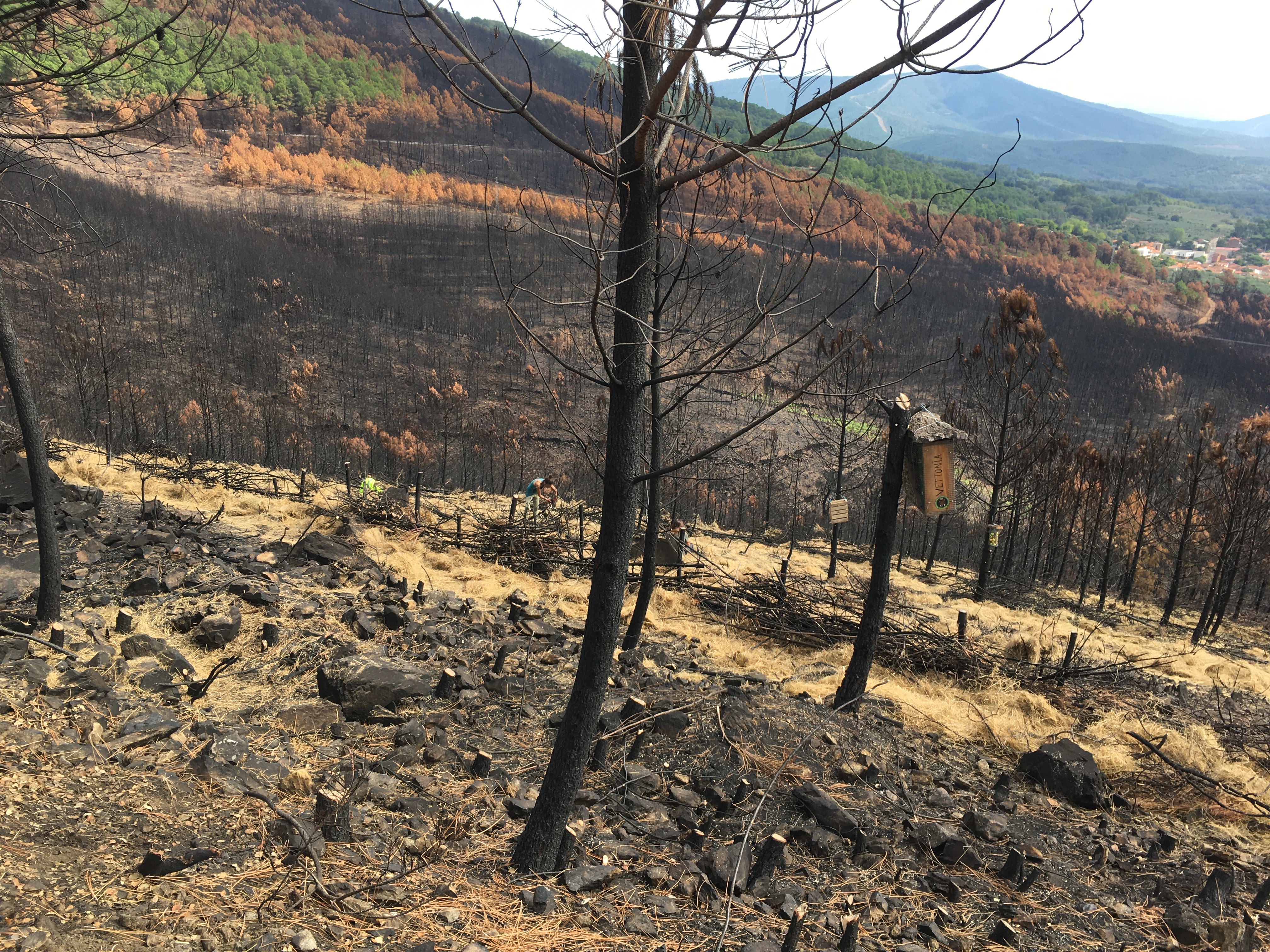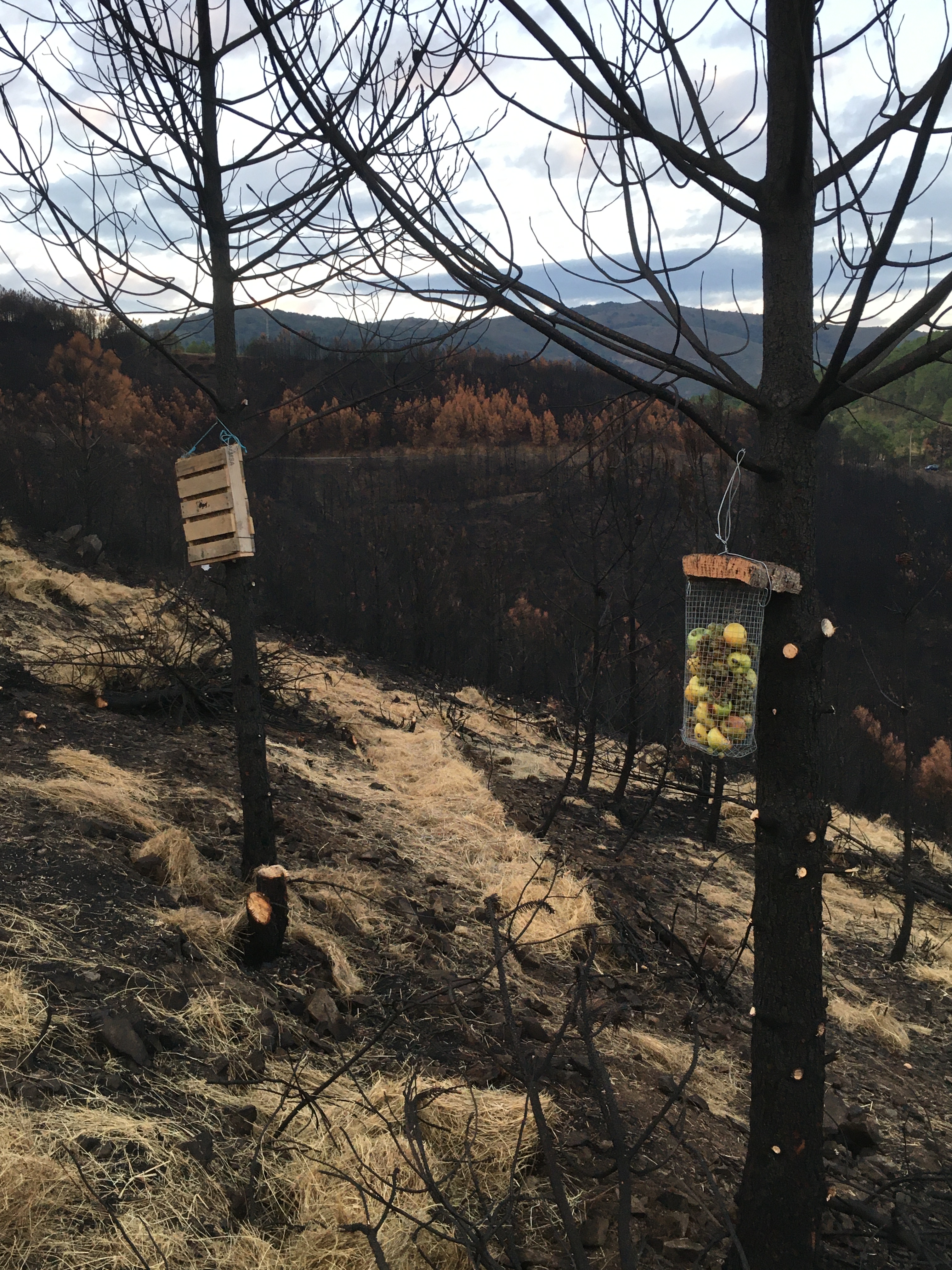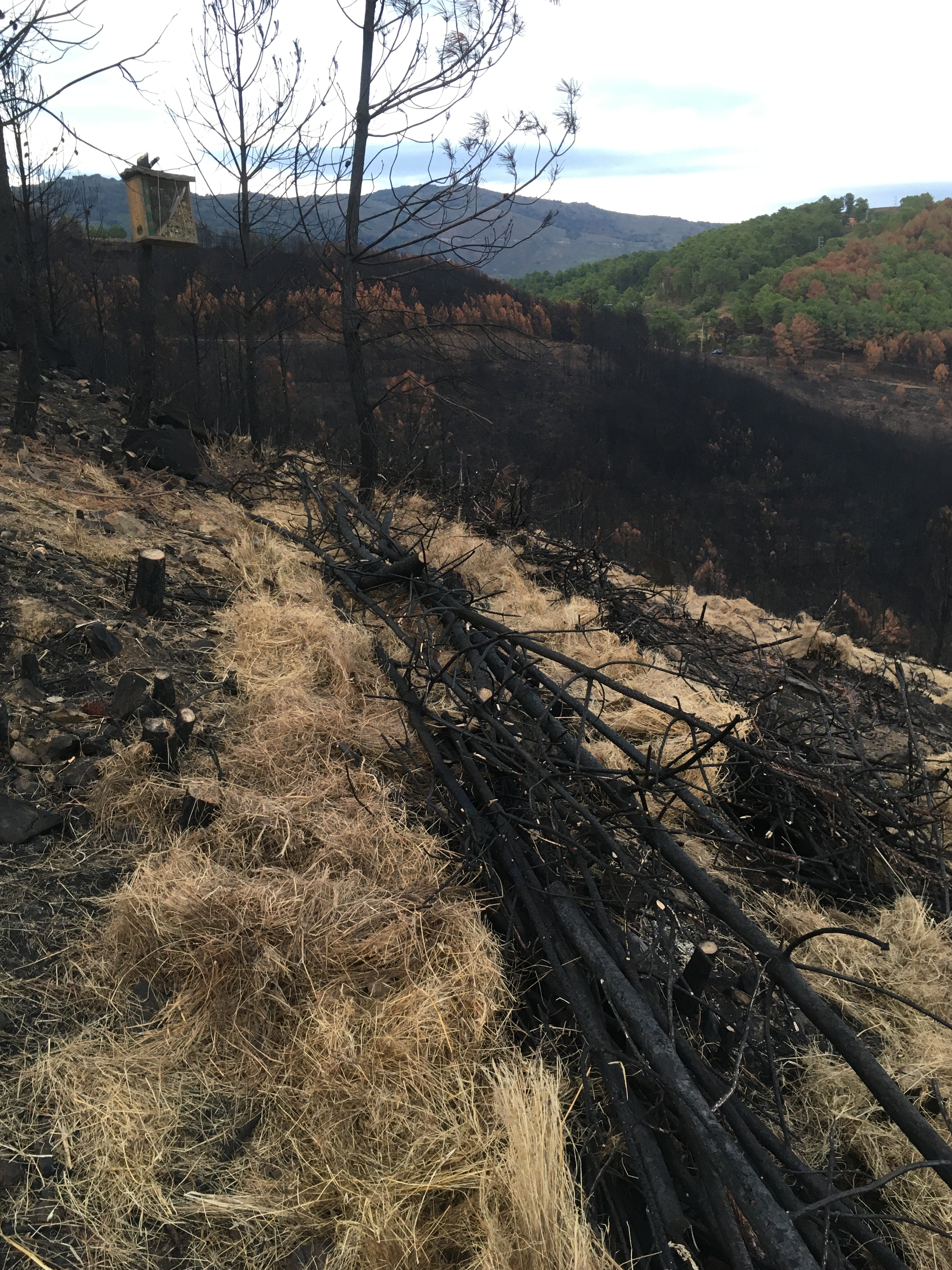 Kurz aufgelistet, haben wir so den Großteil der verbrannten Stämme umgesägt, kleine Gräben und Terassen gezogen und mit Stroh, Ästen und den Stämmen verstärkt, damit sich bei Regen die Asche und die Nährstoffe darin sammeln können Außerdem Weizen und Leguminosensamen verteilt, damit es schnell wieder eine grüne Decke gibt und Vogelhäuser und Insektenhotels aufgehängt.
