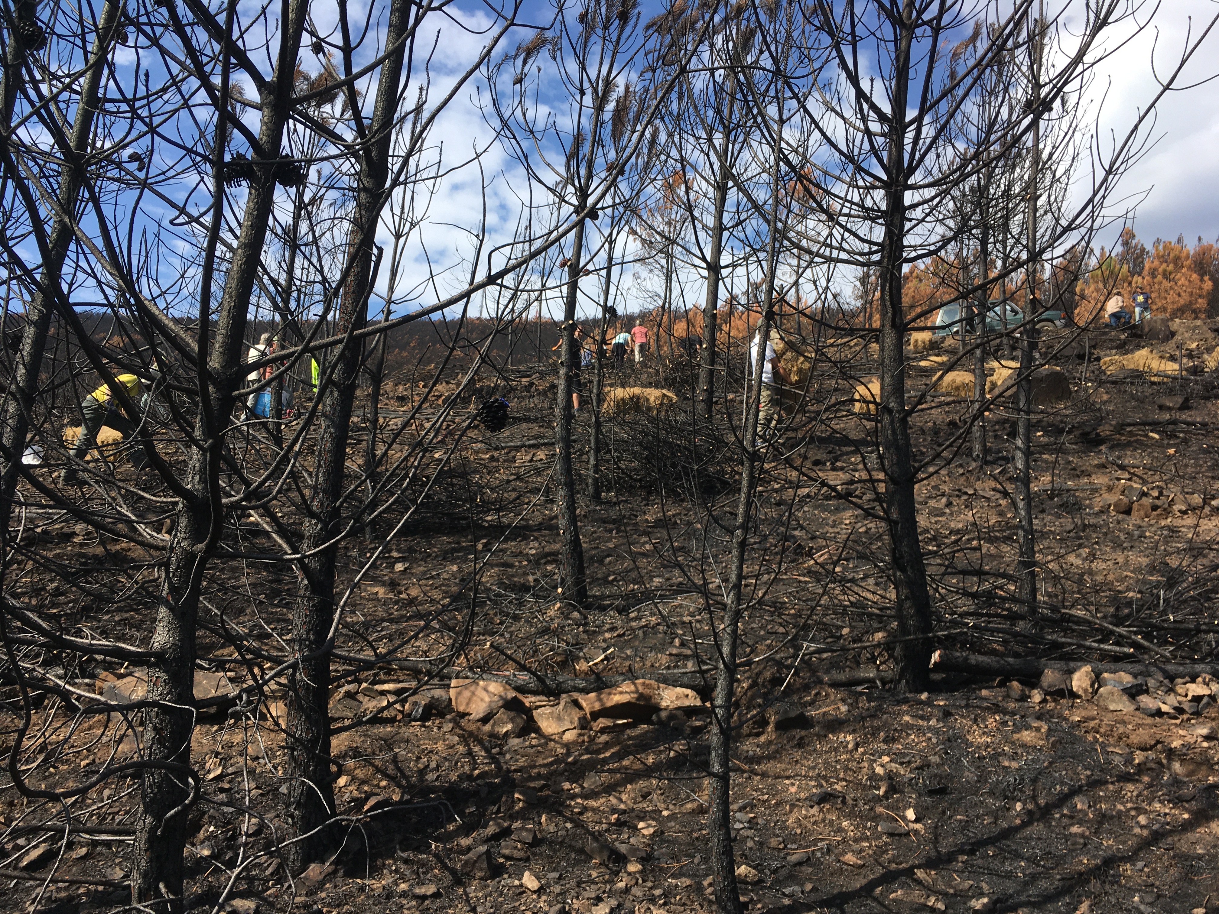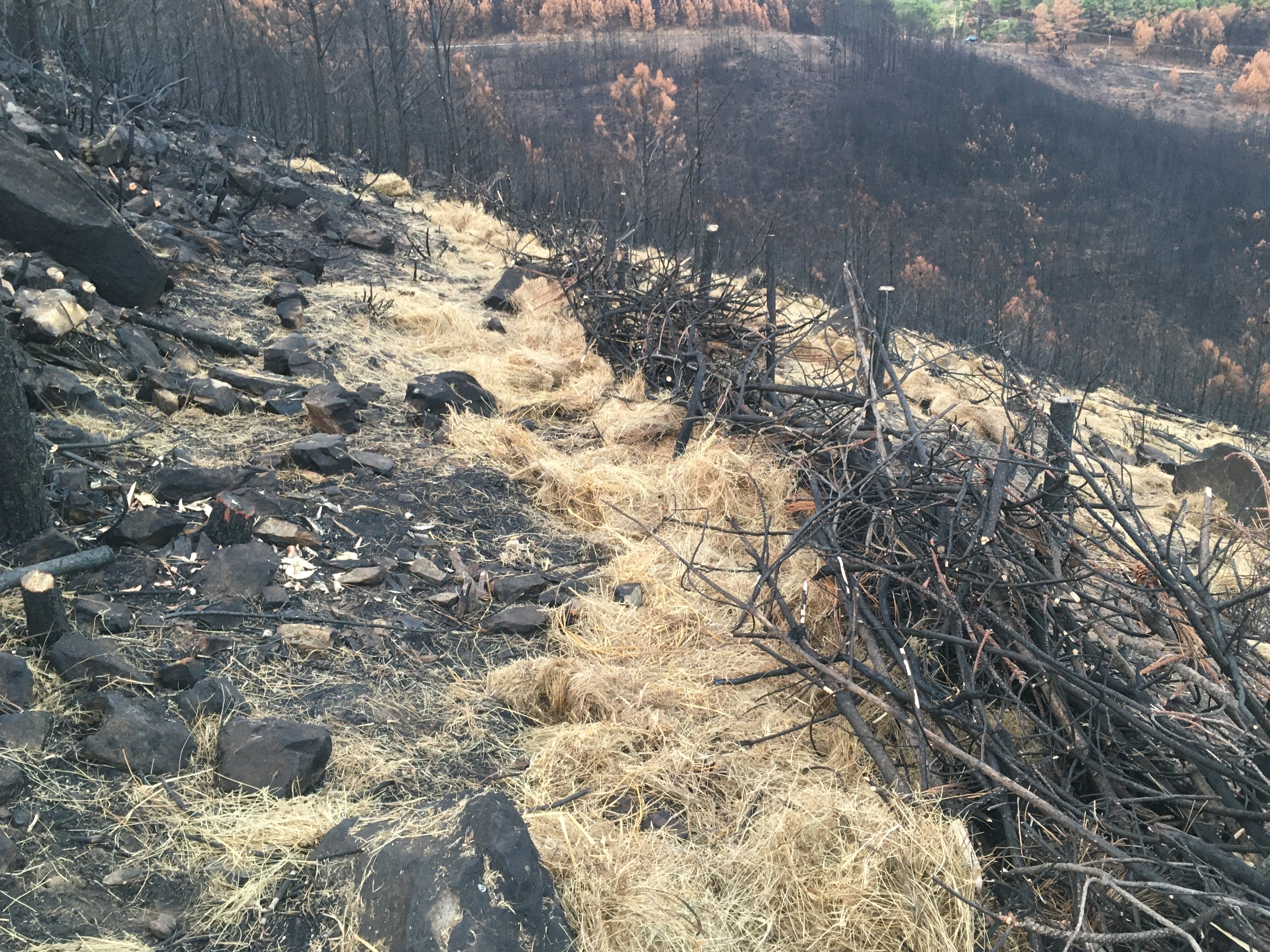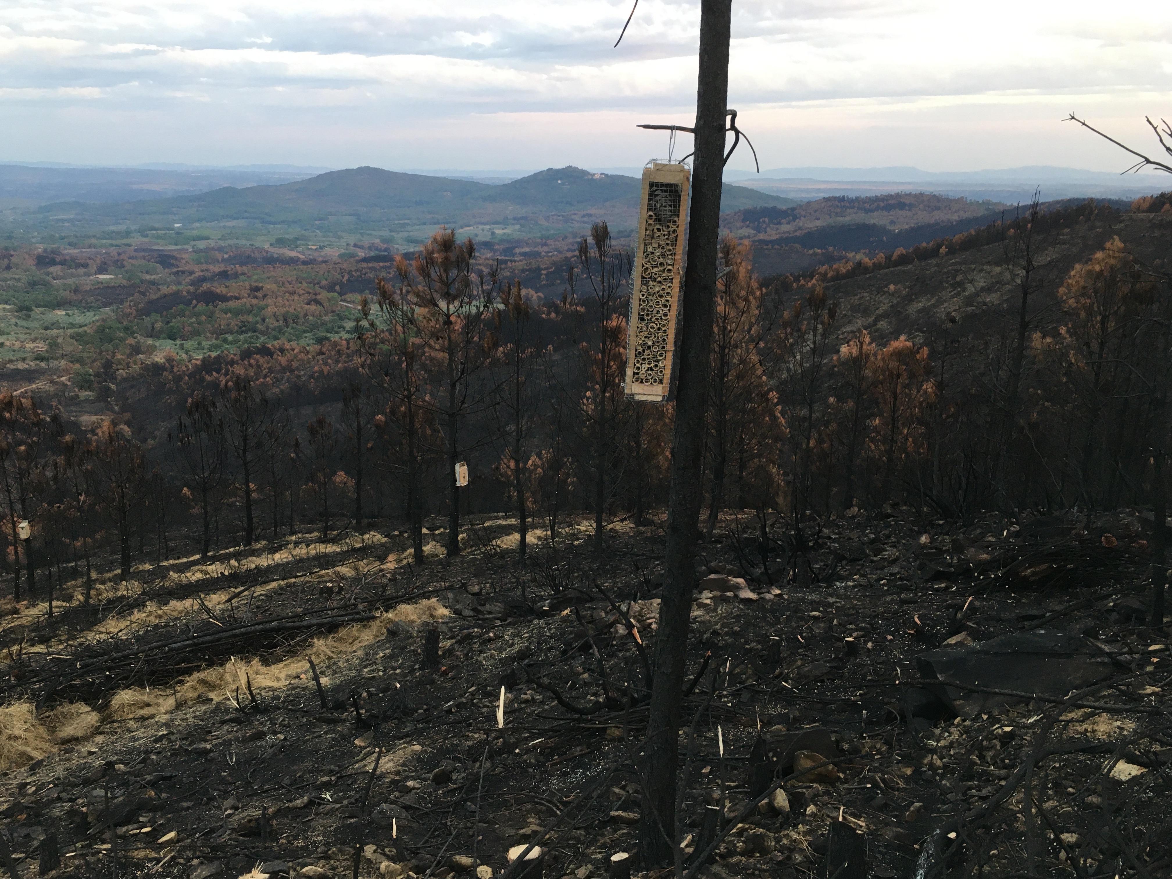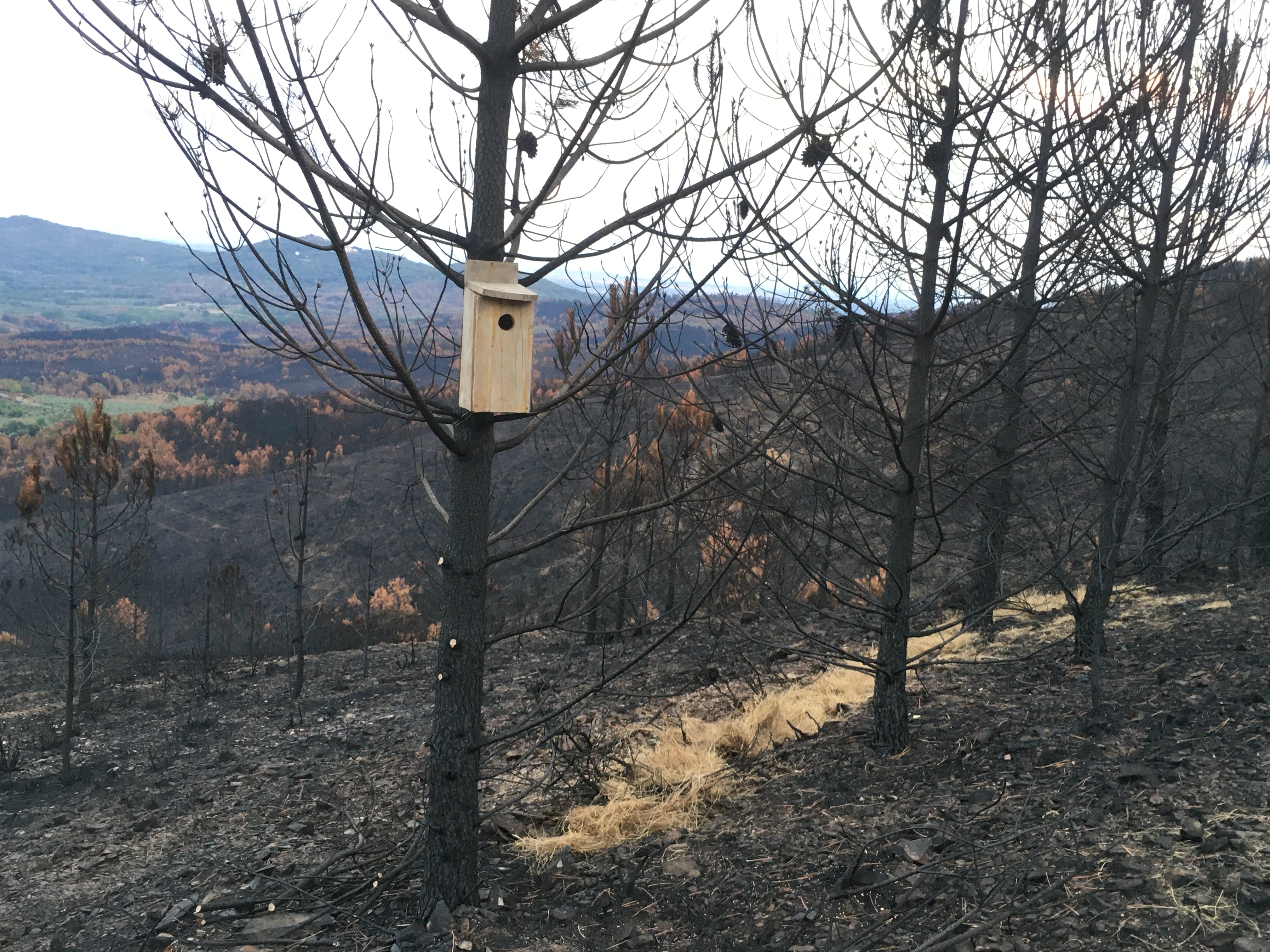 Kurz aufgelistet, haben wir so den Großteil der verbrannten Stämme umgesägt, kleine Gräben und Terassen gezogen und mit Stroh, Ästen und den Stämmen verstärkt, damit sich bei Regen die Asche und die Nährstoffe darin sammeln können Außerdem Weizen und Leguminosensamen verteilt, damit es schnell wieder eine grüne Decke gibt und Vogelhäuser und Insektenhotels aufgehängt.